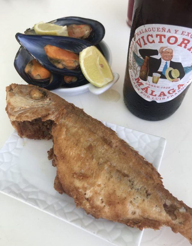 「ムール貝、揚げ魚、アサリのニンニク炒め」