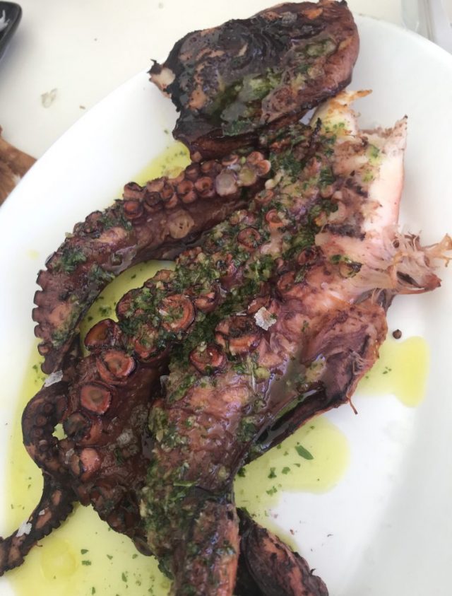 黒川さんのお心遣いで、タコ、エビ、貝、魚のフルメンバー。どの料理もニンニクがたっぷり。テーブル一帯が怪しいニンニク香に包まれたまらない〜。