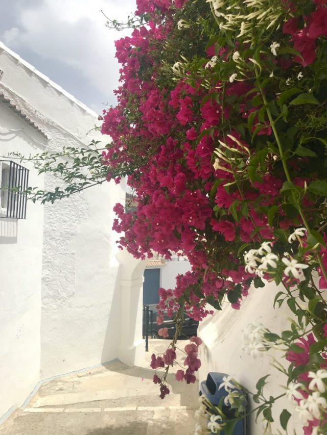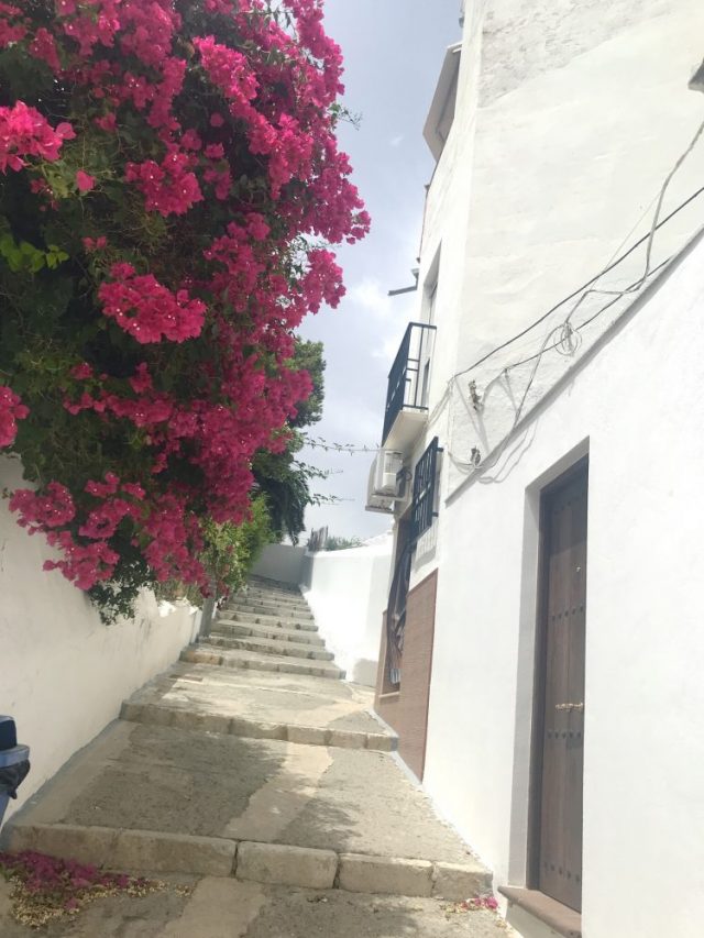 車をとめて歩き出すと、かわいらしい白いアーチを発見。その向こうに、ずっと階段が続いている。ピンクのブーゲンビリアが白壁に映える。ぼんやり眺めていると