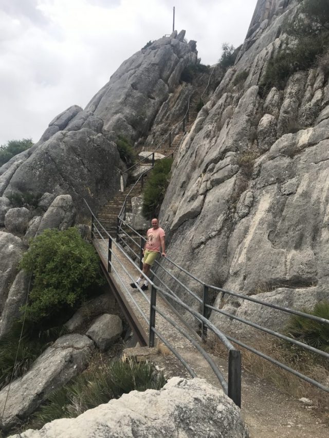 ハビ吉が指差した先を見ると、なんと。超急勾配の階段が、さらに山頂へと続いているのだった。手すりにつかまって登る式のスリル満点系。風はどんどん強くなる。