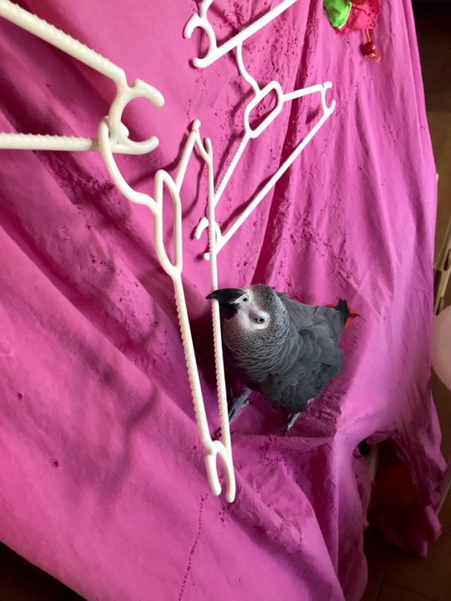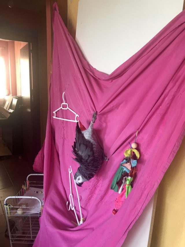 【一日一作プロジェクト】マスクで「エスペランサの炎」を作った。最近、オウムは「シーツ・ジャングルジム」に夢中。さらに運動量を上げるため