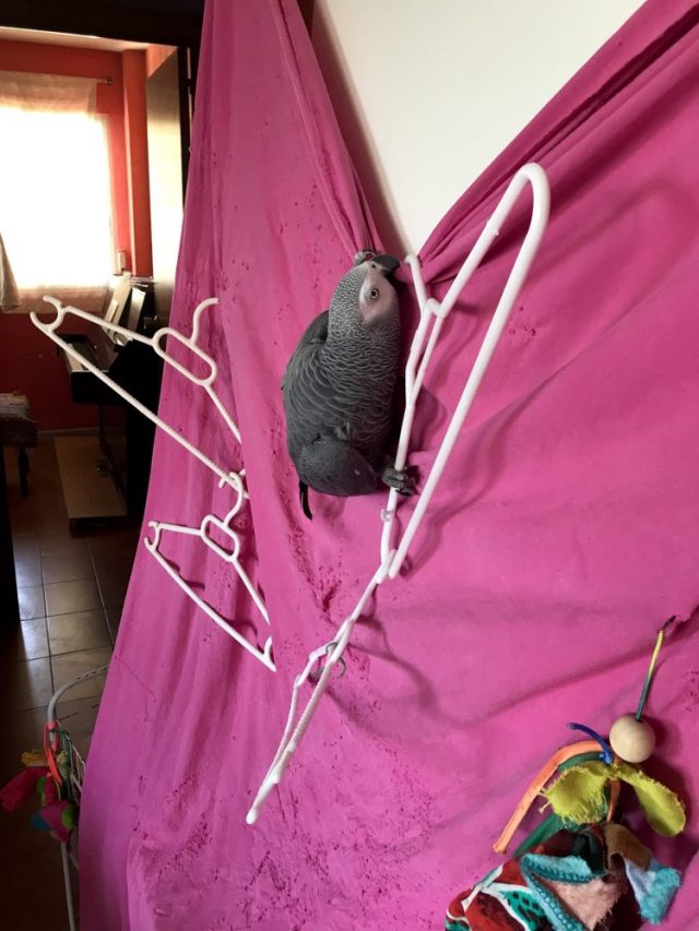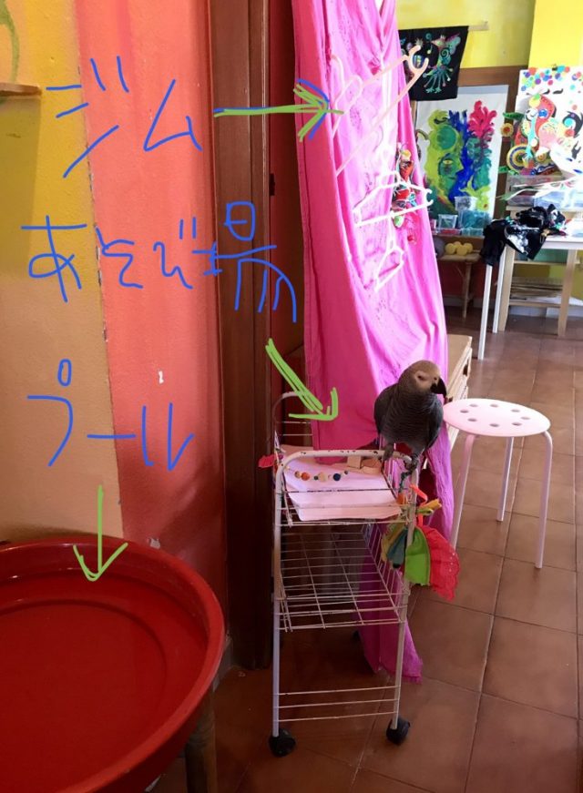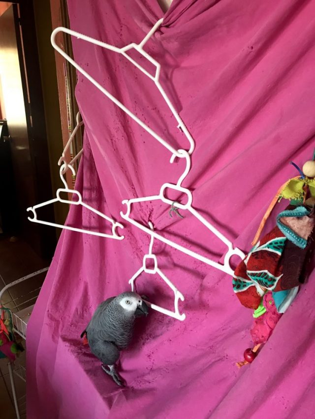 さて。オウムは今日も「シーツジム」に夢中。「遊び場・ジム・プール」が一体化したこのスペース。完全にテリトリー化している。ハンガーを重ねただけのエクササイズコーナー。