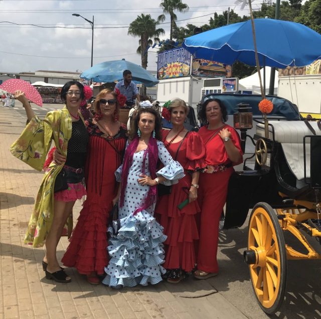 色とりどり&ふりふりのフラメンコ衣装。それが集団になると、とにかく目立つ(笑)毎年、ローカル新聞のカメラマン達にバシバシ写真を撮られる。