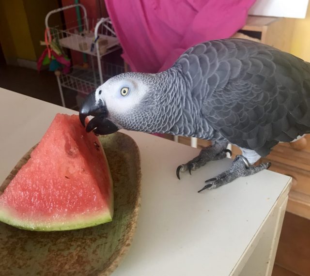 オウムの基本食。茹で野菜、フルーツ、ヨーグルトまでは、私も同じメニュー。唯一の違いは肉や魚。一品多いだけ(笑)。