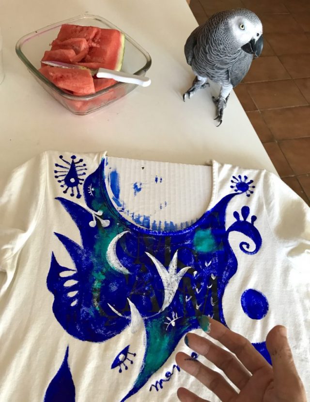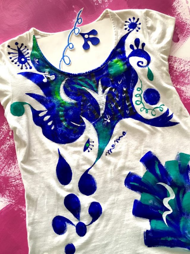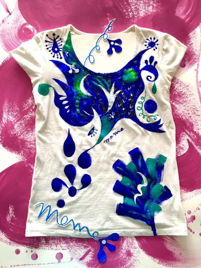 【一日一作プロジェクト】8月1日からペイントを再開。4ヶ月ぶりの絵の具と筆にわくわく。まずは手持ちのシャツをキャンバスに「地中海を泳ぐ月鳥」を作った。