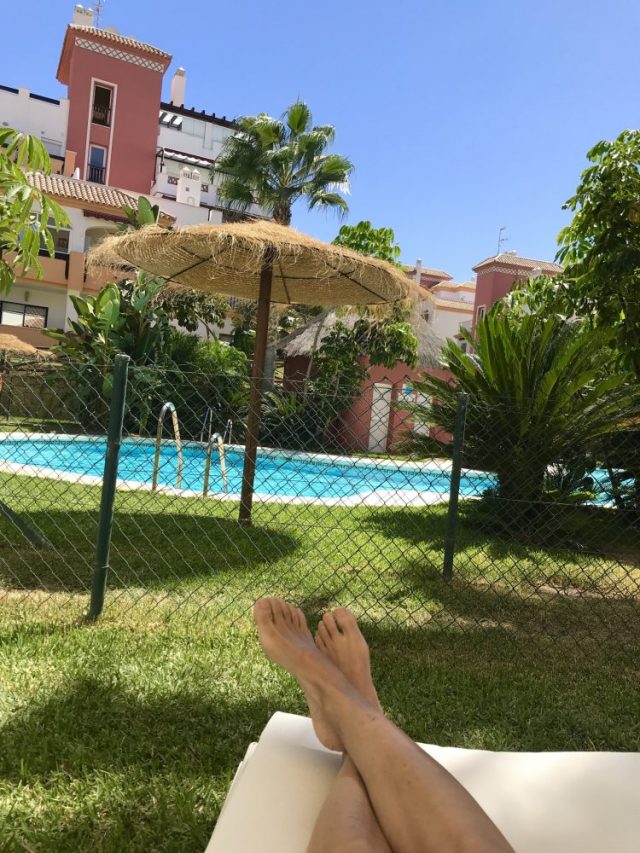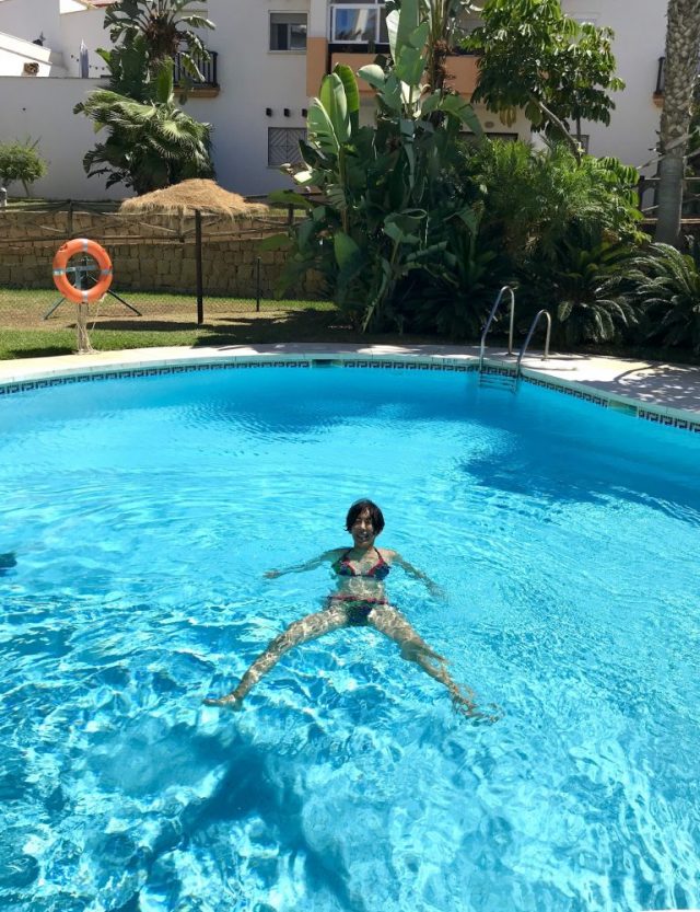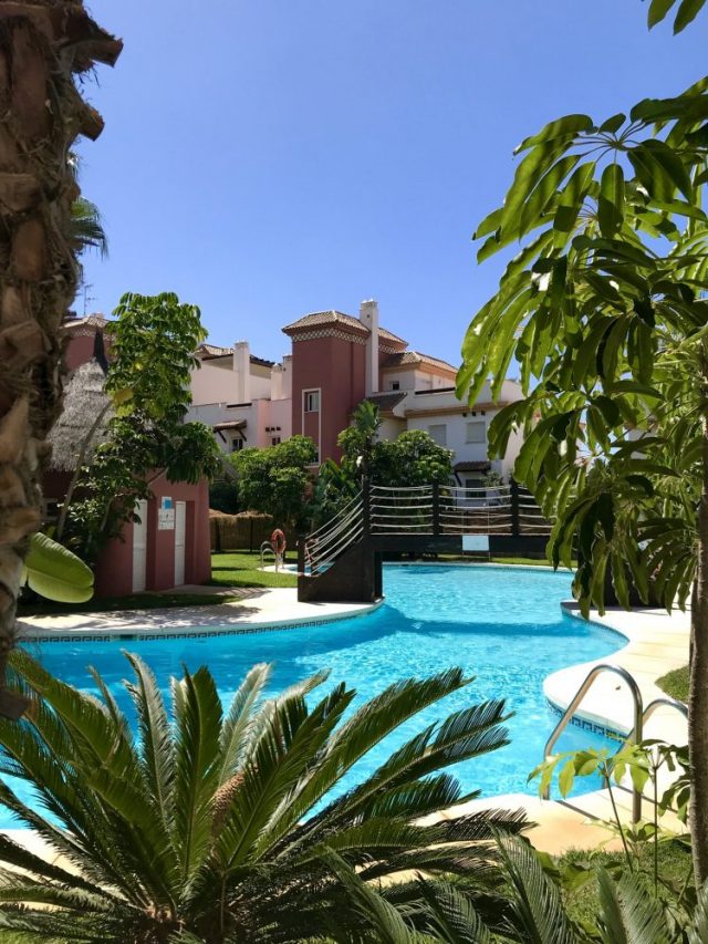 着いてびっくり。まずは写真をご覧ください。すごいな、このプール。ホテルみたい。橋までかかって。デザインもおしゃれ。四角くくないのがいい感じ〜。