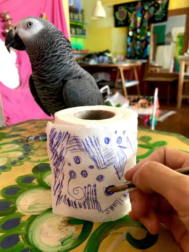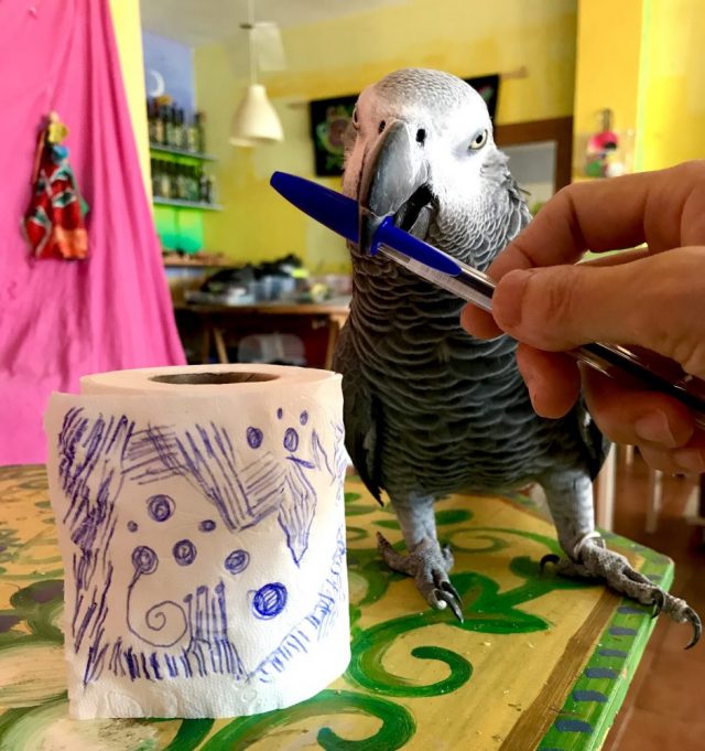 トイレットペーパーは、完全に描ける代物なのだった。巻物のように。どれだけでも広げていける。興奮のオーラを感じ取ったのか、すぐさまオウムが飛んできた。