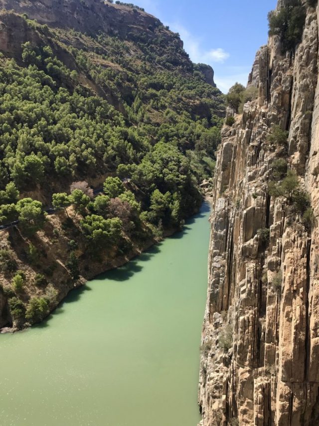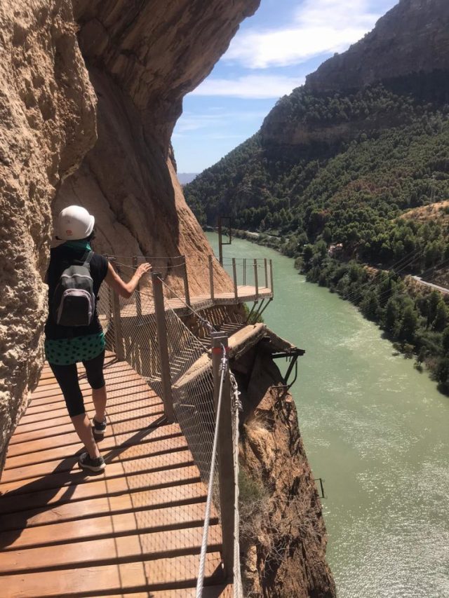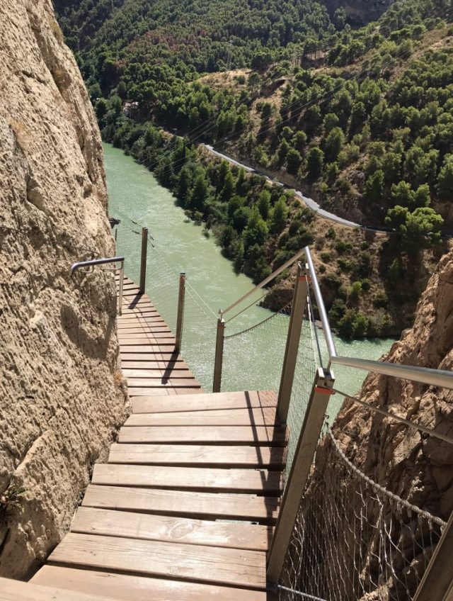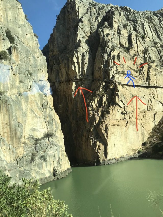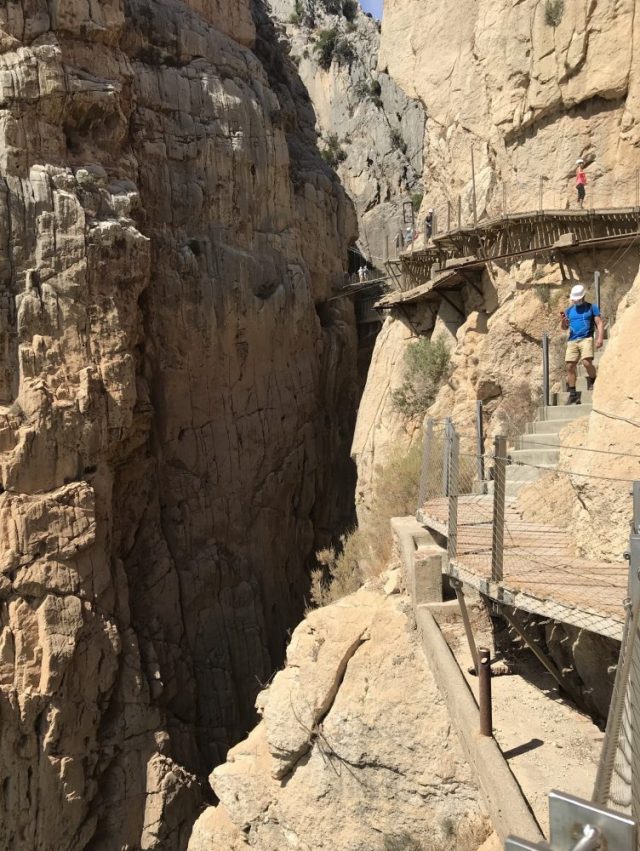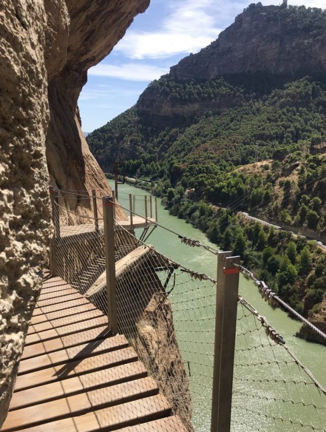 渓流沿いの絶壁に「無理やり」取り付けられたような遊歩道。はるか下に水面が光る。振り返ると、自分の通ってきた道がよく見えて
