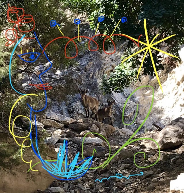 山に思いをはせながら、無心でペイントをする人間と、山ヤギに姿を変えて、聖域を守る山の精霊。