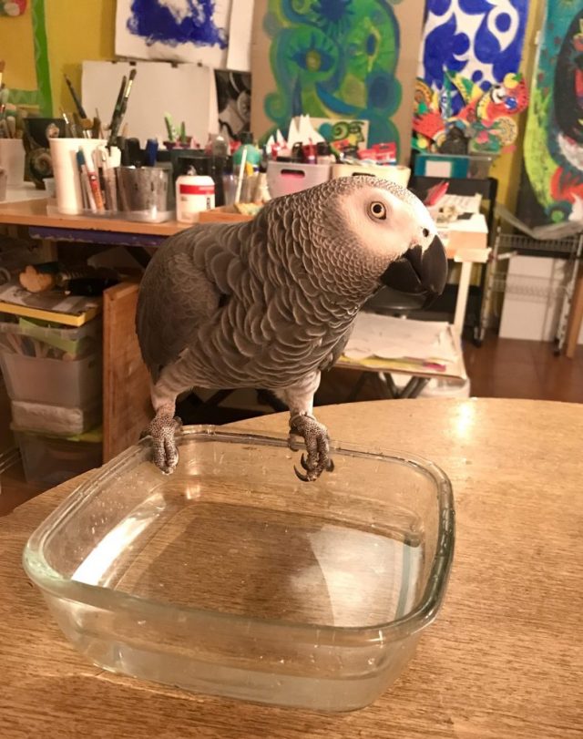 どおりで。干からび感マックス。オウムには「ミニ水浴びスペース」を用意。いつものプールは先週片付けたところ。ごめんね。