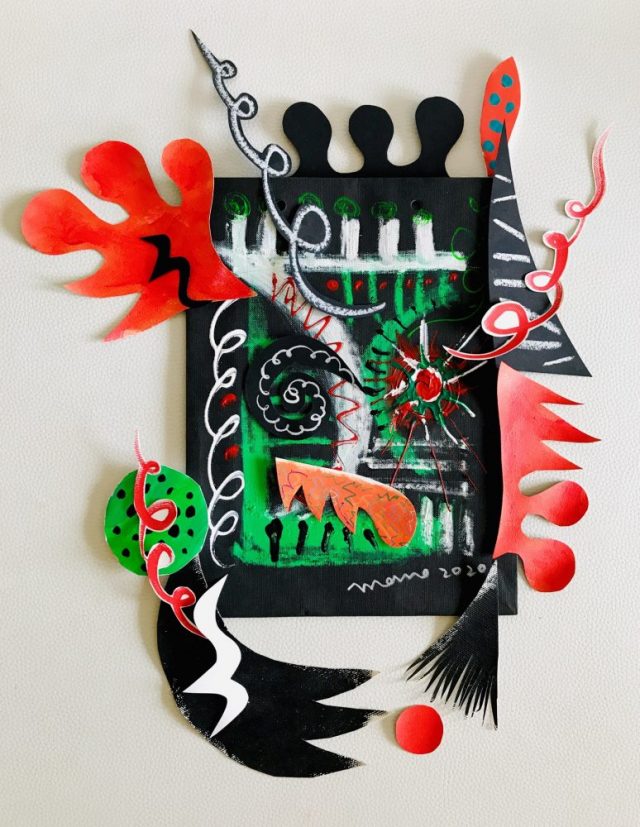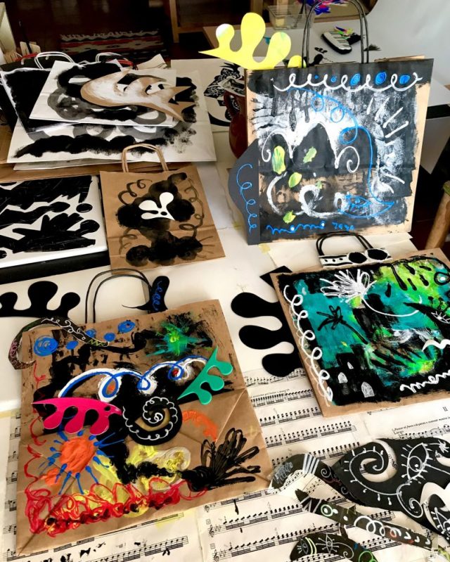 お店の黒い紙袋に、絵の具とクレヨンで楽描き&コラージュ。ショッピングバッグに、命が宿る瞬間。「個」の誕生。もう無名の紙袋じゃ、ない。