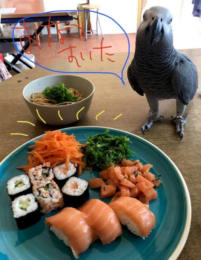 大切に持ち上げよう。奇跡が起こるかもしれない。さて。ものすごい食欲に襲われ、寿司パックに食らいつく。オウムには茹でニンジンとゆで卵、バナナを別皿に用意。