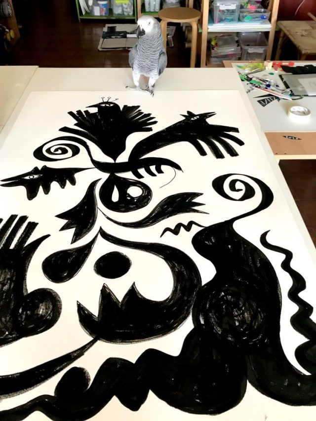 気に入ったのか、入らないのか。不明。よく見ると、オウムの足元に今ペイントしたばかりの「鳥」が!そばには4本足の動物もいるし