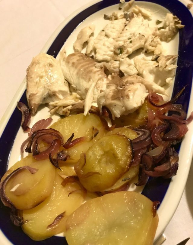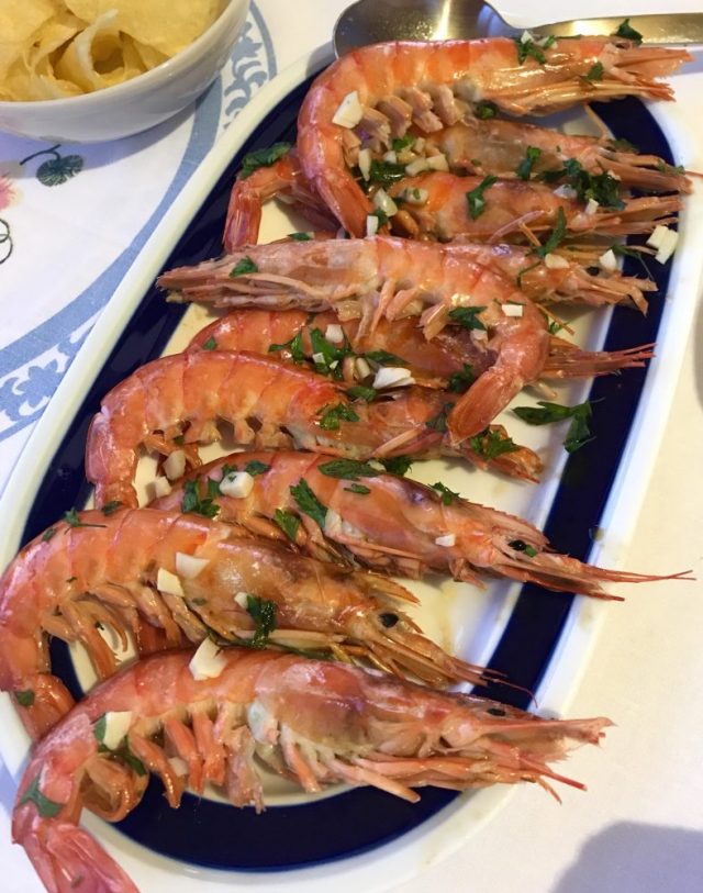 オーブンで焼かれた大エビでスタート。続いて、ドラダ(魚)とポテトのオーブン焼き。なんという贅沢。プレゼントを差し出そうとすると・・・