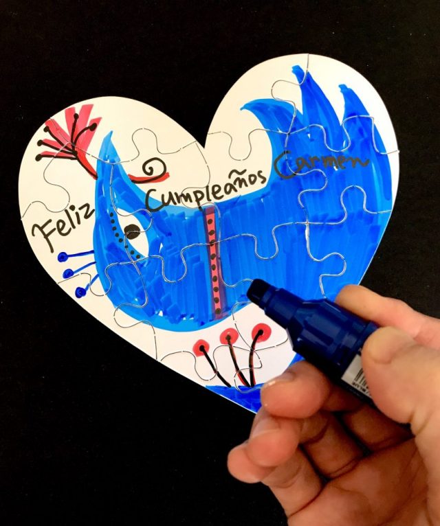 【一日一作プロジェクト】ハート型のパズルで「バースデーカード」を作った。今日はカルメンのお誕生日会。さらさらっとマーカーでペイント。
