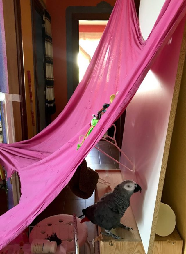 さて。今日のオウムテリトリーはキャンプ風。秘密基地っぽくていい感じ。おもちゃをごろごろ並べてみた。かなりご機嫌。
