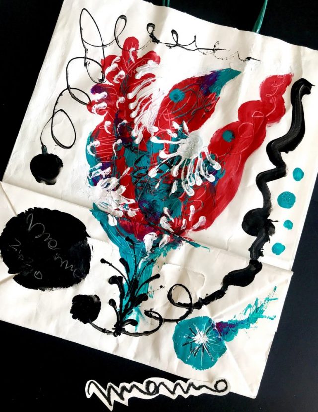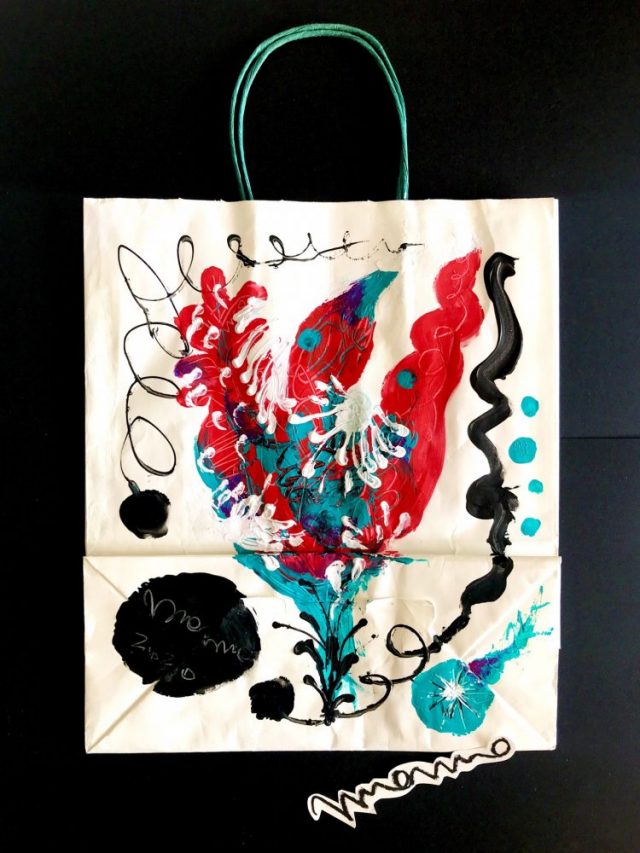【一日一作プロジェクト】紙袋にペイントして「赤鳥、白花、黒涙」を作った。私は体がめちゃくちゃ固い。ストレッチを始めて2ヶ月たった今