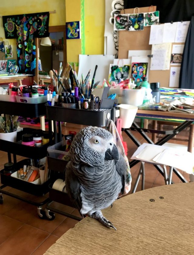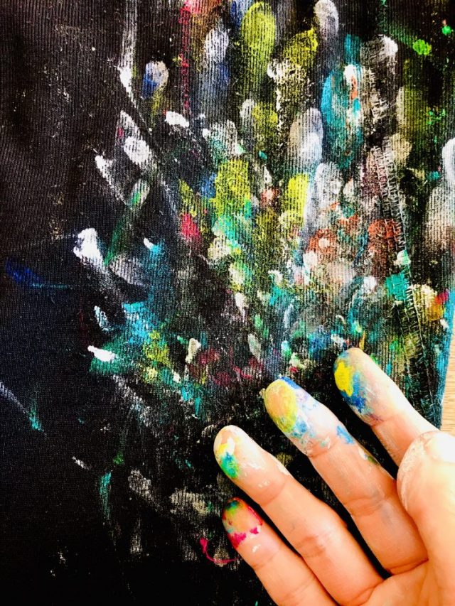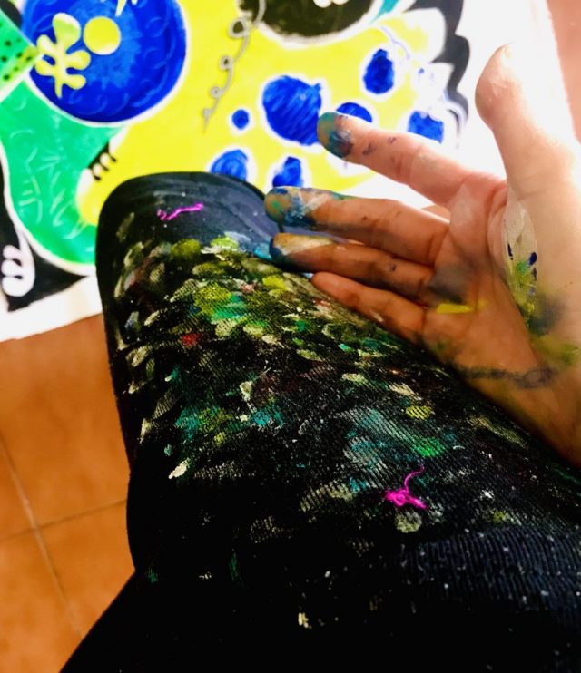 ほど、突き動かされるように絵を描くようになり、気がついたら「服が雑巾化」。特に「右もも」はパレットのごとく。