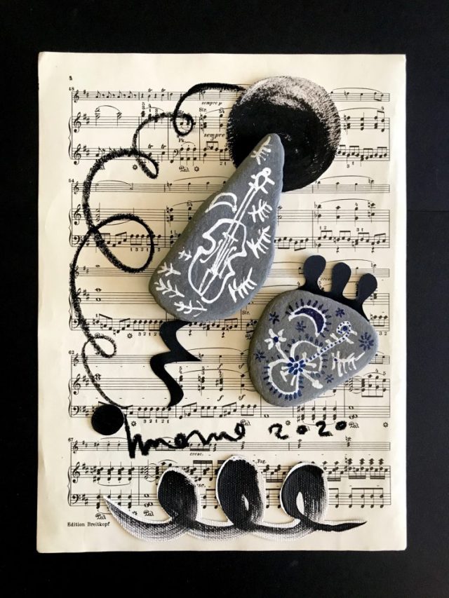【一日一作プロジェクト】石ペイント&楽譜で「遊弓音」「夜香花」を作った。朝起きるとまず「作業着」に着替える。絵の具のついた指先を直接「服」でぬぐうので