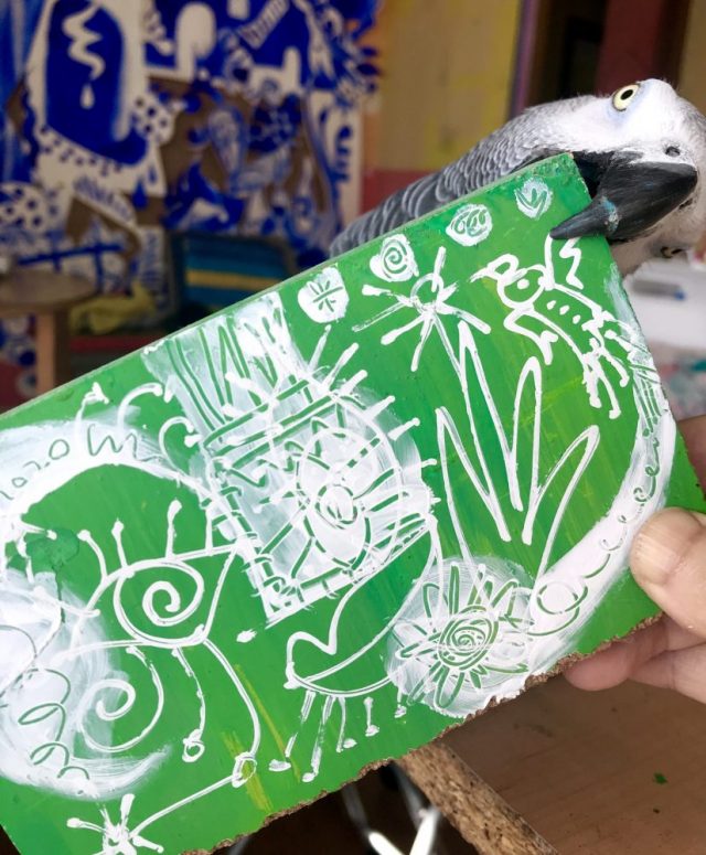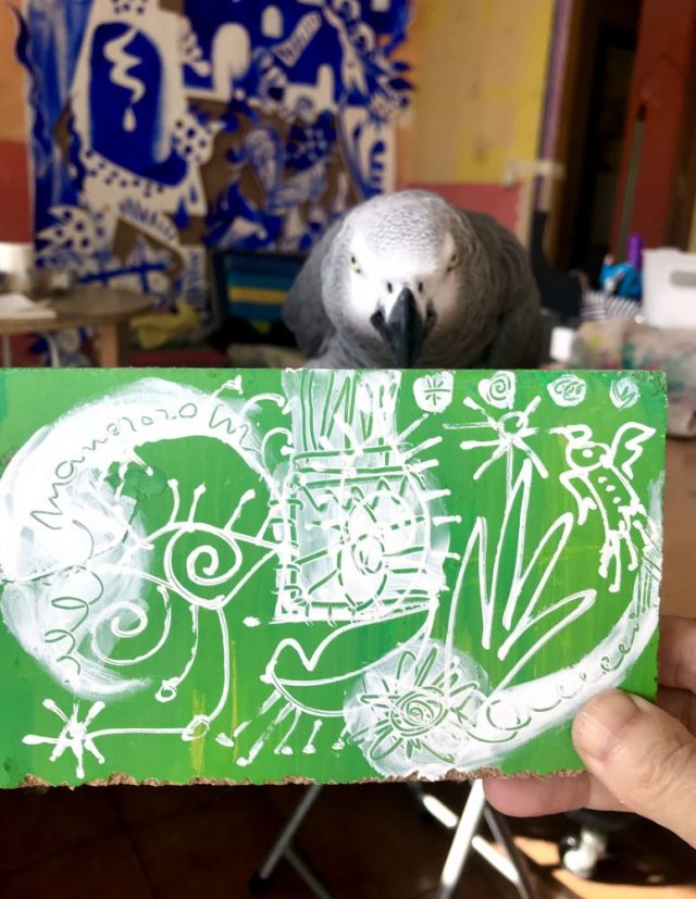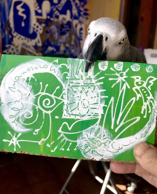 写真を撮っていたら、さっそくオウムがやってきた。それも作品の
