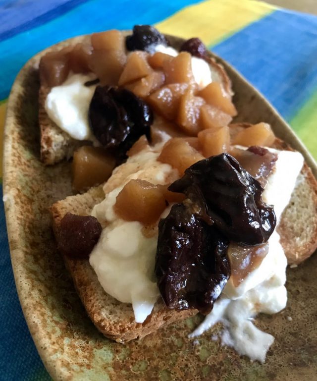を発見。りんごをプルーン、シナモン、丁字、はちみつ、家にあるアルコール(赤ワイン、甘口マラガワイン、ベルモット、ブランデーなど)で煮るだけ。