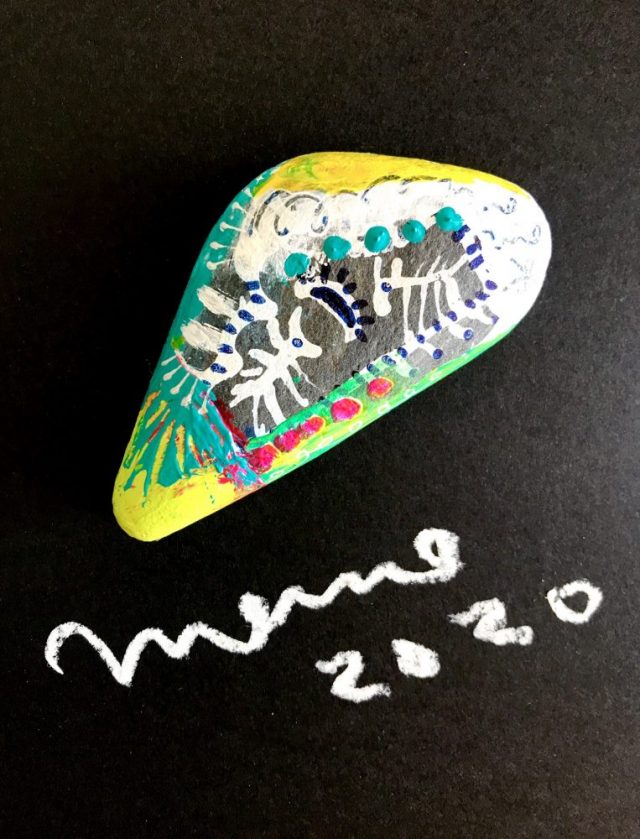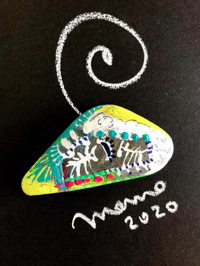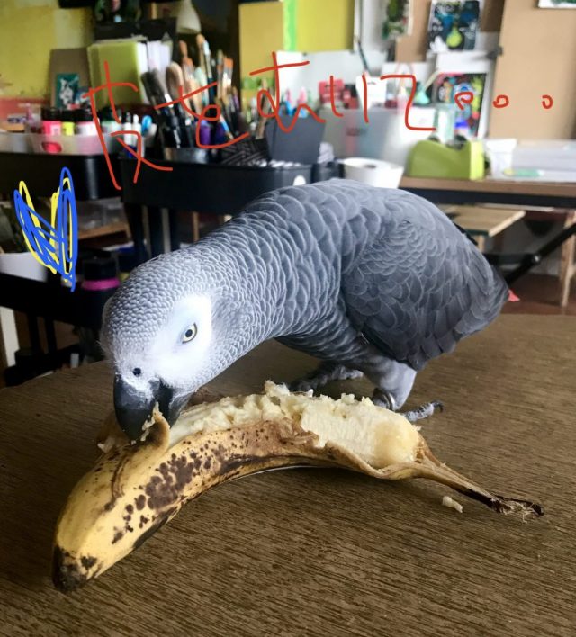 【一日一作プロジェクト】石にペイントして「闇を包むぴかり」を作った。大好物のバナナを見るや、一目散に飛んできたオウム。私の手から奪い取るや一心に