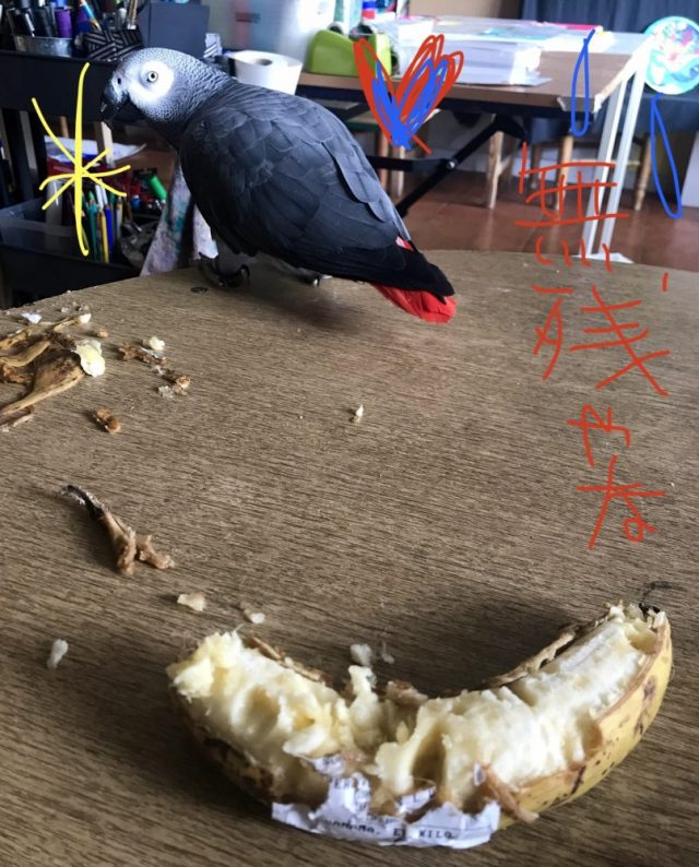 なので、いつもは切り分けて与えている。その前に手元から奪われたので勝手に食べ散らかされ、テーブルにはバナナの残骸が。あまりの惨状に