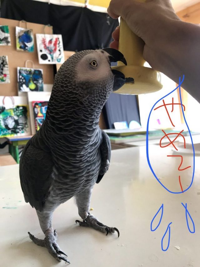 私の作業をじっと見守るオウム。これでテーブル周りが明るくなるはず。さっそくスイッチオン。