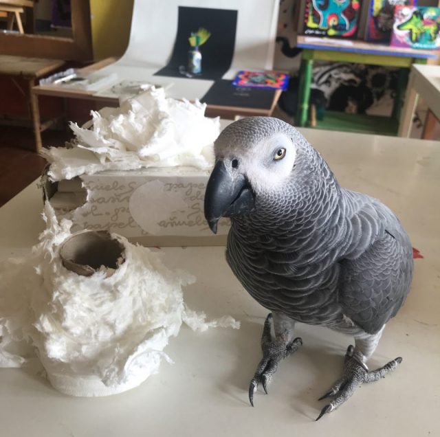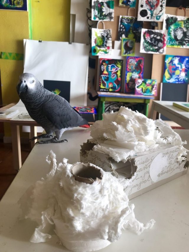作品タイトルはわからないけど、しばらく飾っておくことにしよう。オウムの基地であるIKEA三段引き出しの上に。なんかギャラリーみたい(笑)。