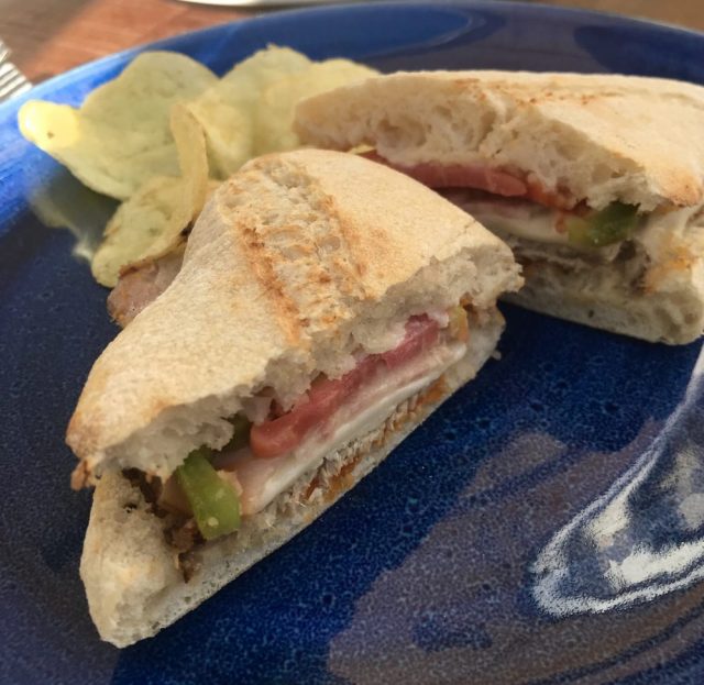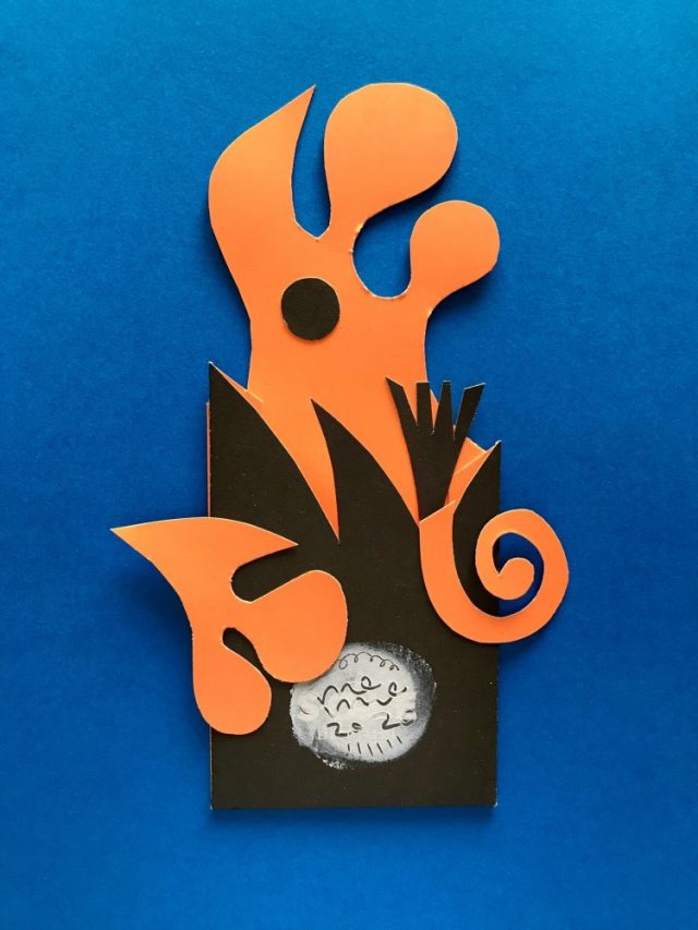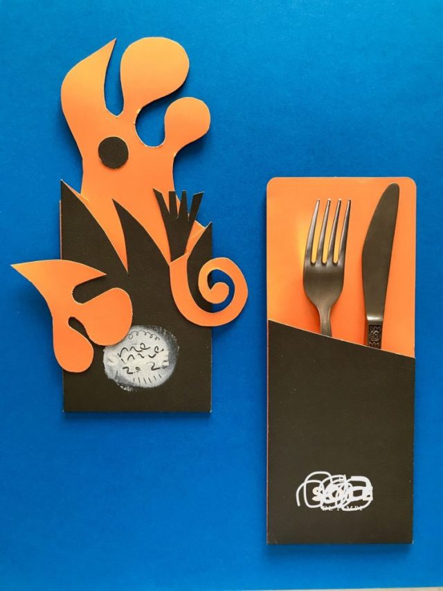 【一日一作プロジェクト】友人とテラスランチ。フォーク&ナイフの入っていた厚紙で「波夜花(なみよばな)」を作った。おとついうちの前の海岸に