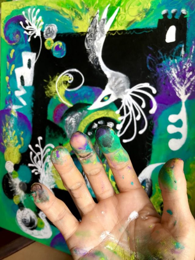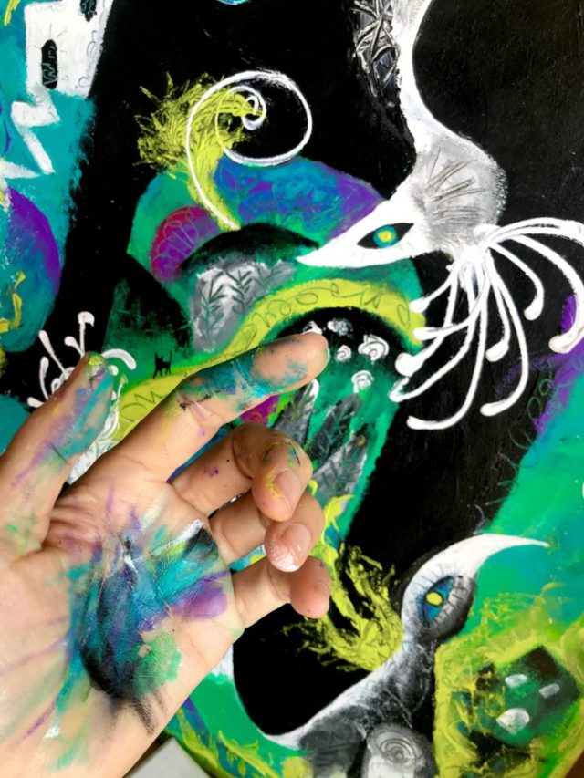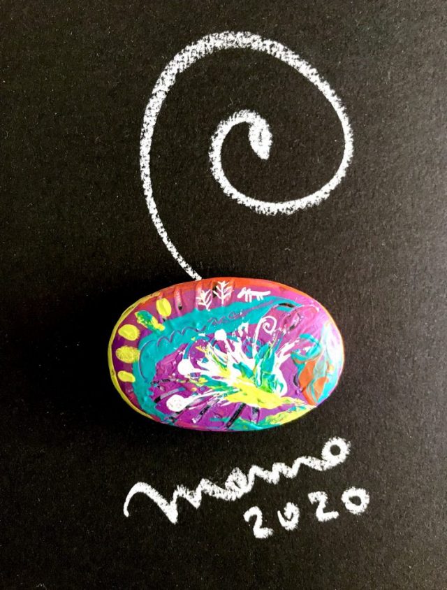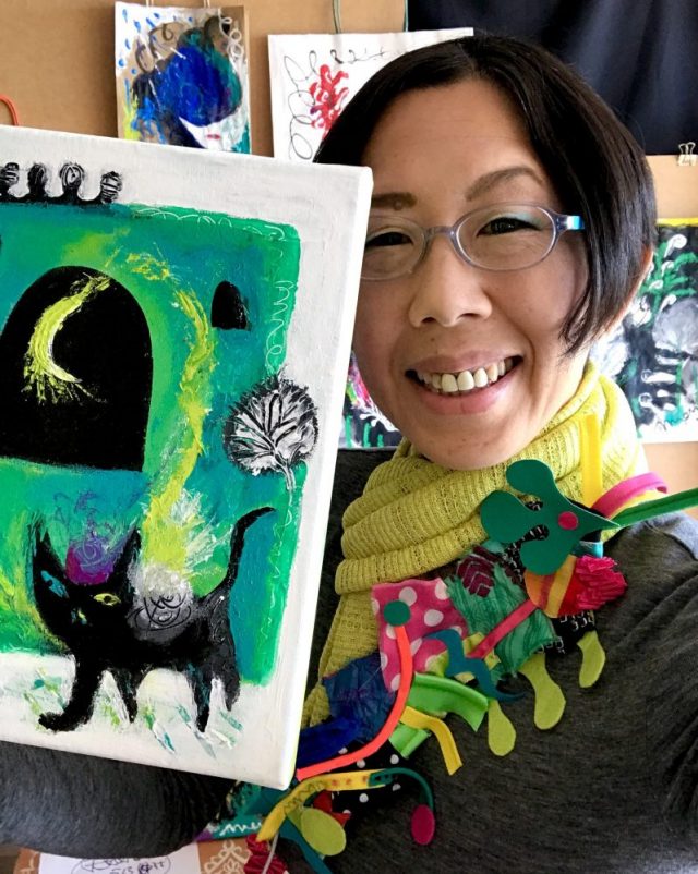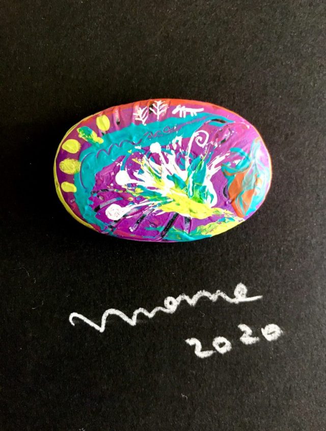 【一日一作プロジェクト】石にペイントして「一人夜花(ひとりよばな)」を作った。その横で、黒猫を主人公にした「物語アート」も進行中!アトリエはもう壁も床もいっぱい(汗)。