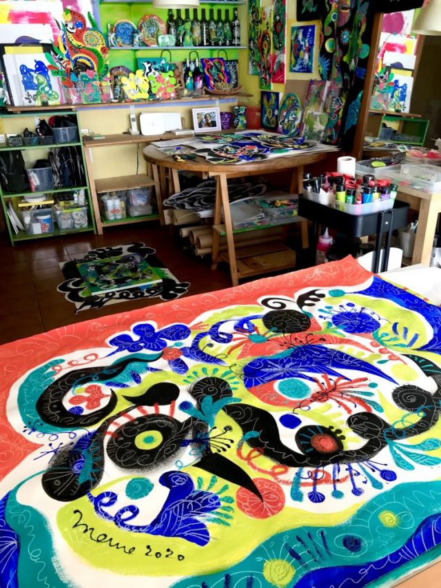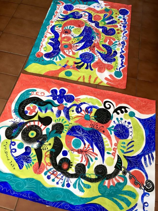 さて。キャンバス地を床に広げてペイント中(写真)。最初は床で、さらにテーブルで。カーペットやテーブルクロスにいい図柄(笑)。家の中が明るくなりそう〜。