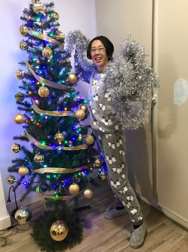 うちにはツリーも、ろうそくも、何もない。唯一あるツリー用ピカピカライトは「間接照明」として、テーブルを明るくするのに使われている。