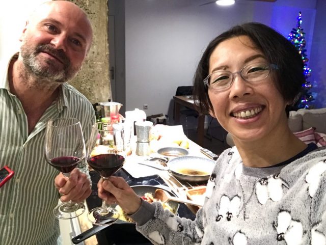 「まずは赤ワインで乾杯〜」「サルー」
