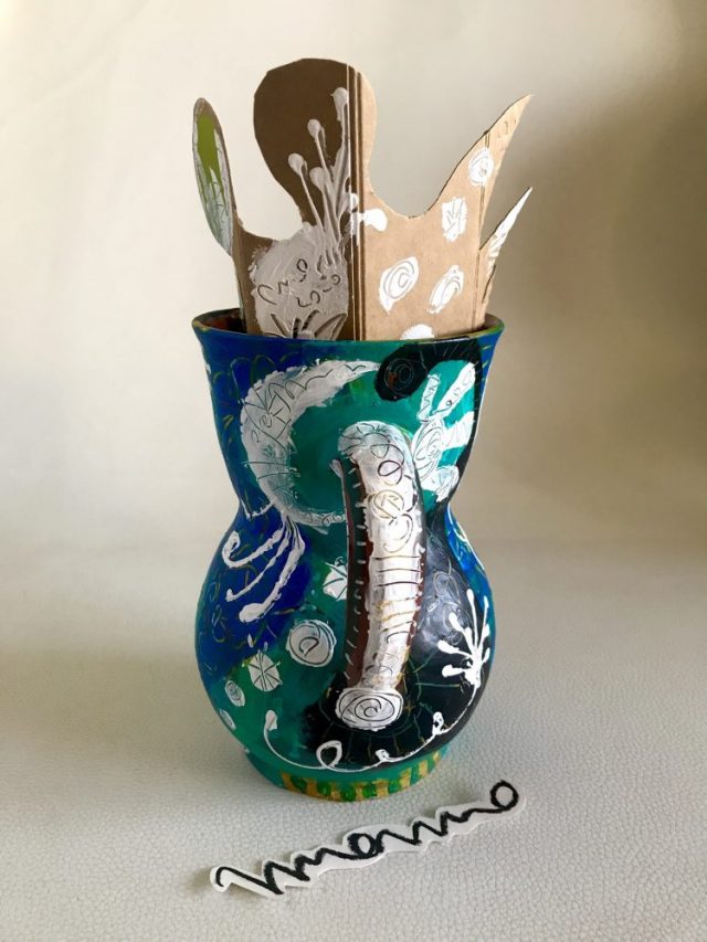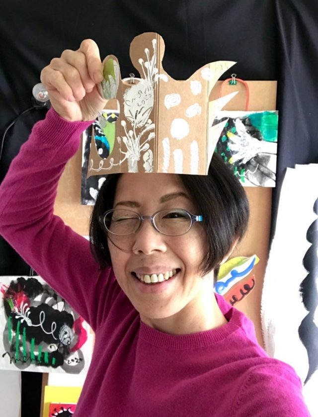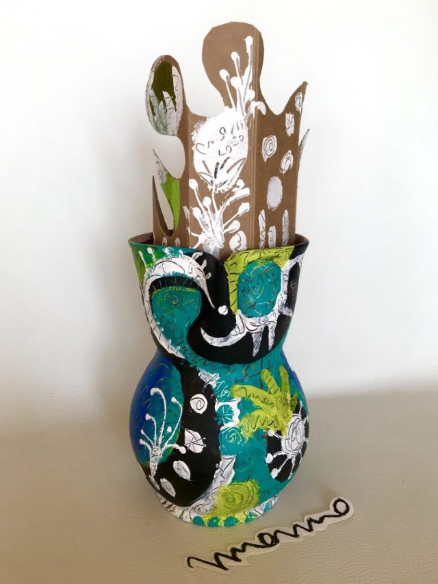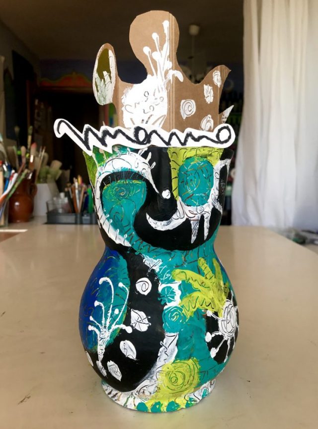【一日一作プロジェクト】ペイントしたカートンを見つけ、カットして「桜冠(おうかん)」を作った。これ、実は空き箱。箱の折り目を活かしてカット。半立体アートに。