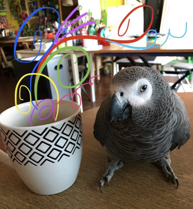 鼻歌まじりにオウムが現れた。温かいマグカップがいたく気に入った様子。すぐそばに寄り添い、ぶわっと丸く膨らむ(←ごきげんの印)。