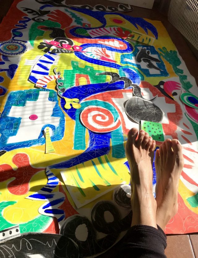 思い残すことなくロックダウン。アトリエの床に「大の字」になって休みたいが、日の当たるスペースは全て、制作中の作品に占領されている。
