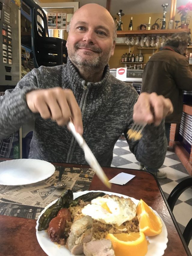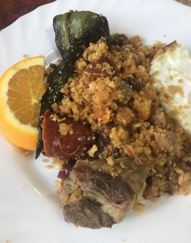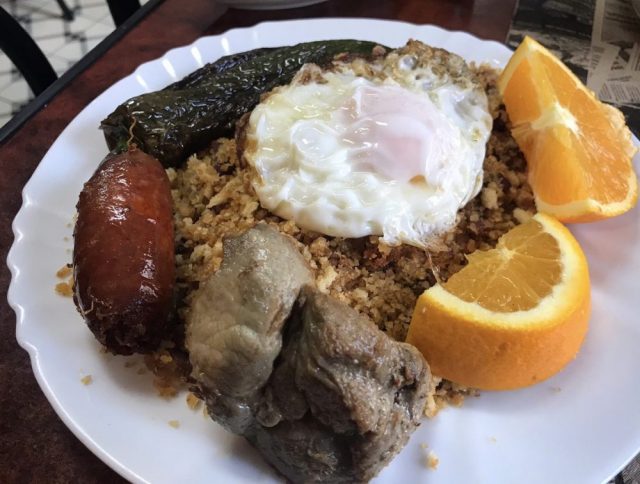 お姉さんとお客さんが「ふふふっ」と笑う。さっそく熱々のスープでスタート。ミガス、チョリソー、豚肉・・・次々とたいらげる。至福の時。