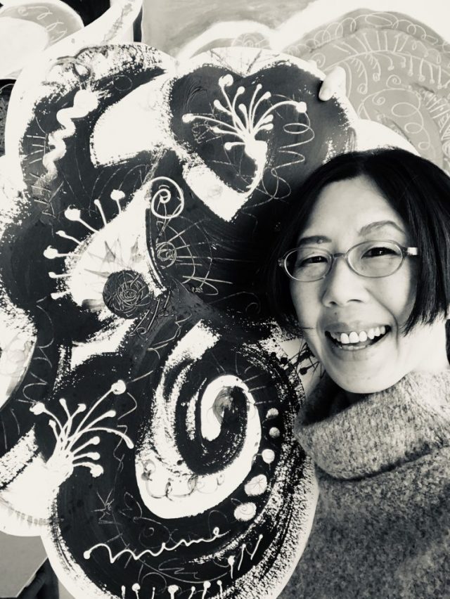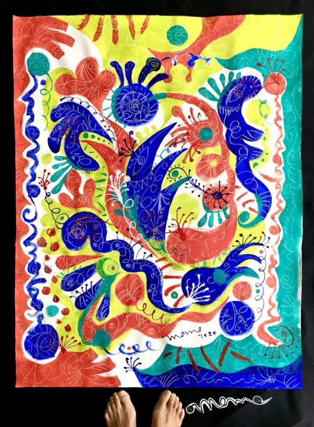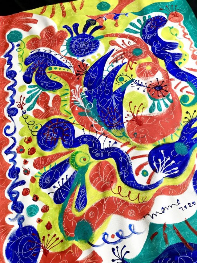 図柄(笑)。こんな上でごろごろしたり、お皿置いたり。楽しそう〜。おうちが華やかに〜。実は「2020年」とサインを入れてから、ペイントを再開。まるで違うものに生まれ変わった。