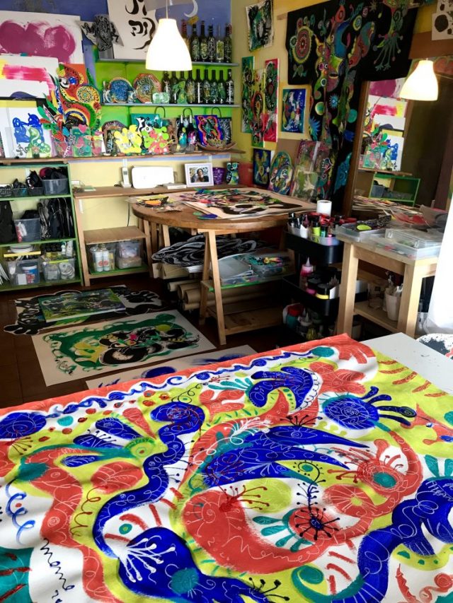 【一日一作プロジェクト】キャンバス地にペイントして「はぐくみ宴(うたげ)」を作った。床も、壁も、テーブルも進行中の作品でいっぱい。スペースを作るため