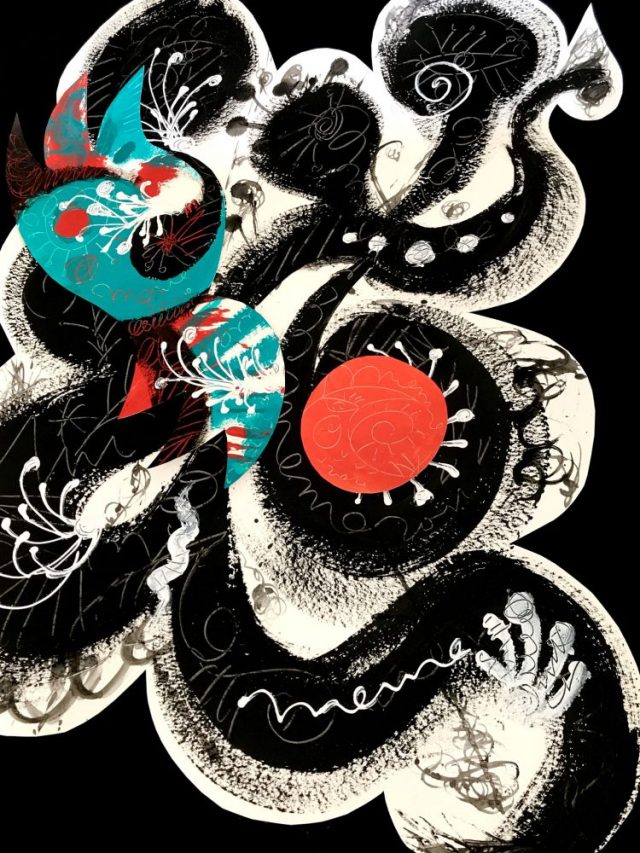 ぐるぐる、でこぼこ道だからこそ、歩くのが楽しい。見上げれば、そこには真っ赤な太陽が。カリグラフィアートのパーツを組み合わせて、新しい作品を作る予定だったけど、心はすっかり