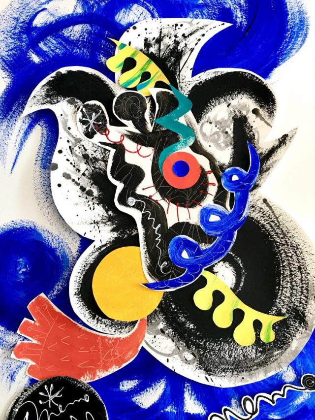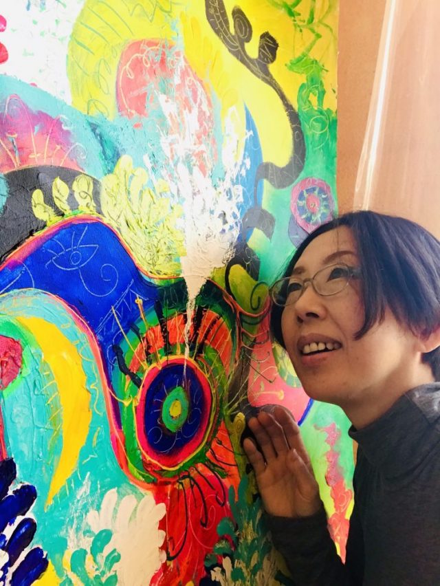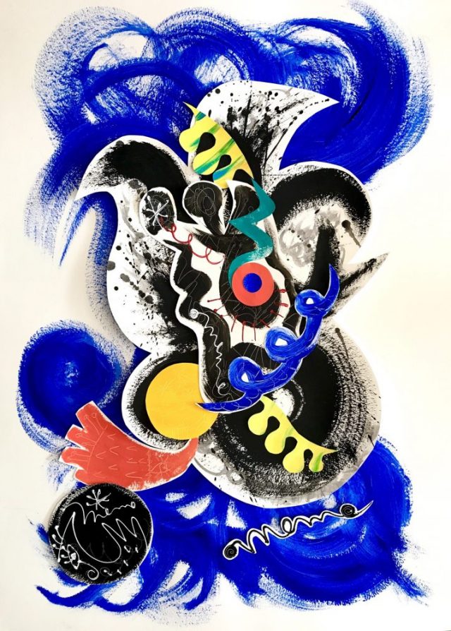 「水(青ペイント)」の上に「音」文字が乗り、その上に「道」文字が。カリグラフィアート三つ重ねスタイル。