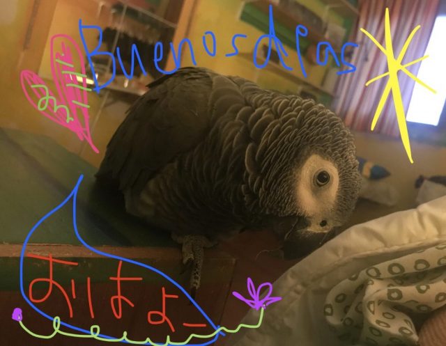 その顔「おはよー」と言っている。よね?(写真)。「目覚めると布団の脇にオウム」って最初は変な感じがしたけど、本人は大満足。