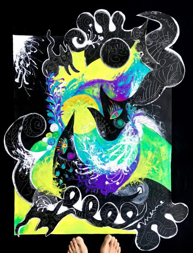 【一日一作プロジェクト】物語アート「月と古城と羽の生えた猫」シリーズ3作目を作った。キャンバス3枚重ねのスタイルに挑戦。これにてシリーズ完了!やった〜(涙)。