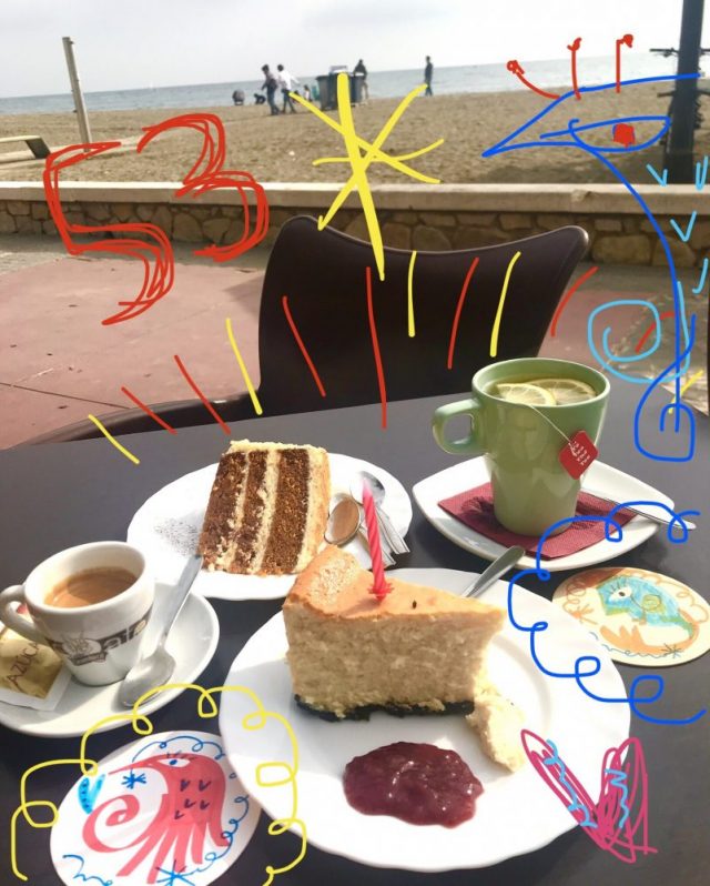海を見ながらのんびりおしゃべり。それが何よりのプレゼント。チーズケーキとにんじんケーキ。ロウソクの灯りは、お店のイケメンお兄さんが点けてくれた。