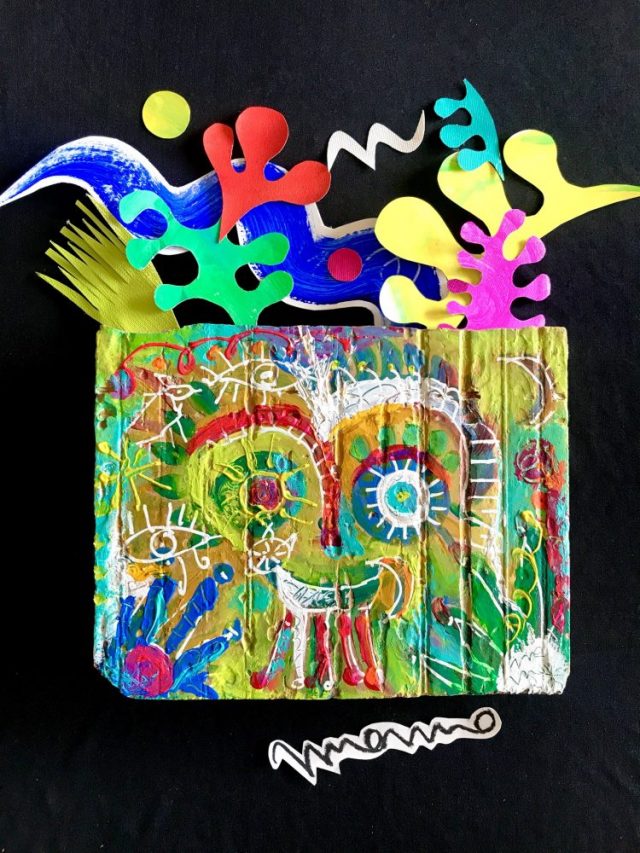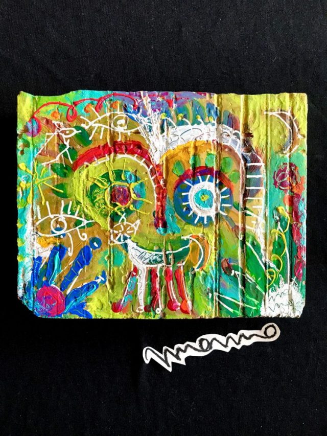 レンガにペイント&コラージュ。こういう素材を扱うと「屋外で作業をしてみたい」としみじみ思う。大地に足をつけて。風の中で。光の下で。