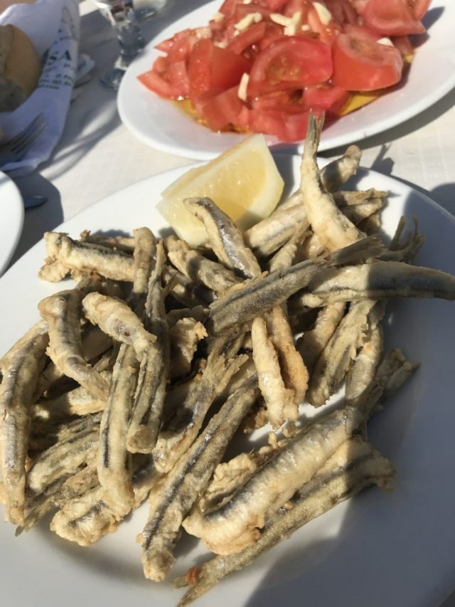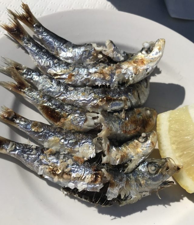 マラガっ子の定番。海を見ながら焼きイワシ。まずはビールで乾杯。炭火焼きだから、塩&レモンだけでめちゃおいしい〜(残念ながらクリスティーナの写真はNG)。