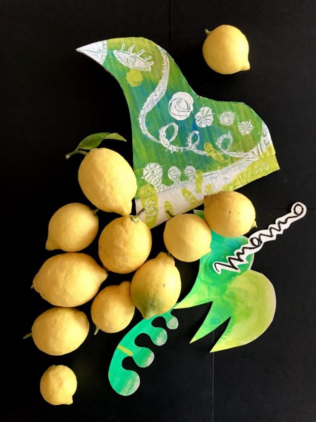 レモンの実を「音玉」「鳥の羽」に見立てて。鳥であり、ピアノでもある。リモーネス(レモン達よ)、一緒にコラボアートで遊んでくれてありがとう!