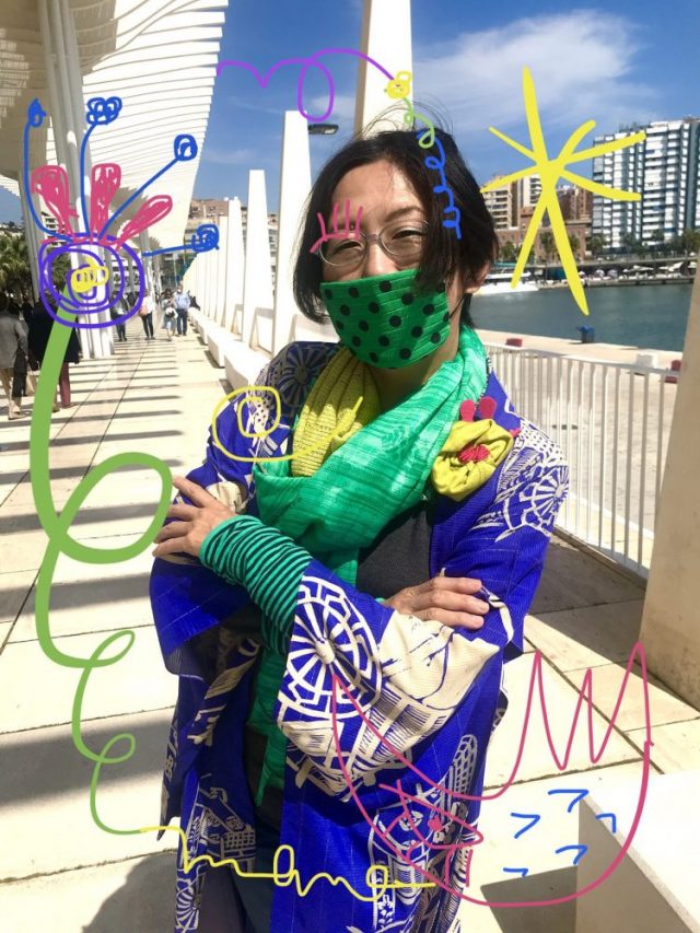 ものたち(汗)を、まとめてブローチアートに。これなら大好きな色を活かして遊べる〜。ついでに紹介すると、着物写真の「緑のマスク」「緑&黄のスカーフ」も全て