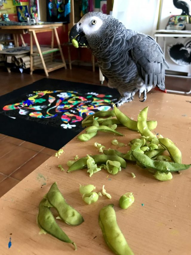 朝食に「枝豆」と「イチゴ」を用意したら、いつのまにかオウムに食い荒らされていた(写真)。枝豆を手に、こちらを無視してむさぼり食うその姿は、まさに